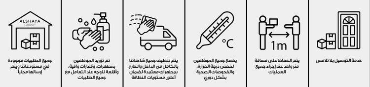 سوف نحرص دائماً على إتباع جميع الإجراءات الصحية ووسائل التعقيم والنظافة لنوفر لكم تجربة تسوق مريحة وآمنة من المنزل